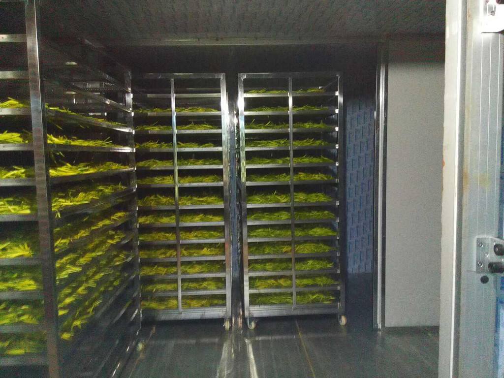 烘干工藝第三步:將高溫蒸煮后的黃花菜均勻鋪放到物料車內(nèi),注意厚度均勻,每層不超過3CM。