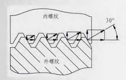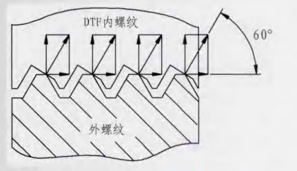 DTFLOCK螺母在內(nèi)螺紋的牙底處有一個30°的楔形斜面,當螺栓、螺母擰緊時,螺栓的牙尖就緊緊地頂在螺母的楔形斜面上,從而產(chǎn)生了很大的鎖緊力。由于牙形的角度改變,使施加在螺紋間接觸所產(chǎn)生的法向力與螺栓軸成60°角(見圖2),而不是像普通螺紋那樣的30°角,DTFLOCK螺紋法向壓力遠遠大于扣緊壓力,因此,所產(chǎn)生的防松摩擦力也就必然大大增加了。